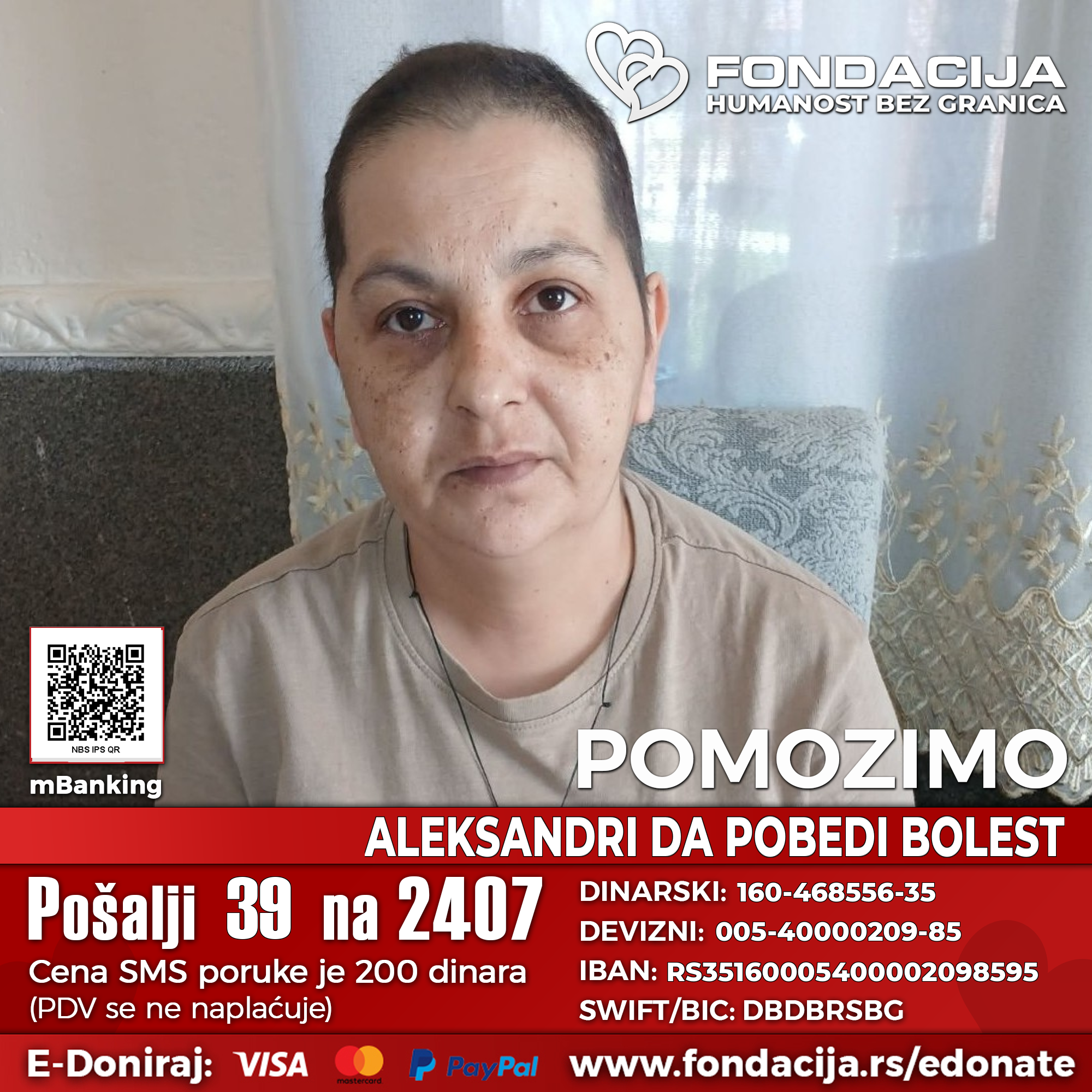 Ona je majka troje dece i svakodnevno pokazuje izuzetnu snagu, hrabrost i nepokolebljivu želju za životom. Iako je početno lečenje davalo ohrabrujuće rezultate, došlo je do naglog pogoršanja i terapija mora hitno da se nastavi.