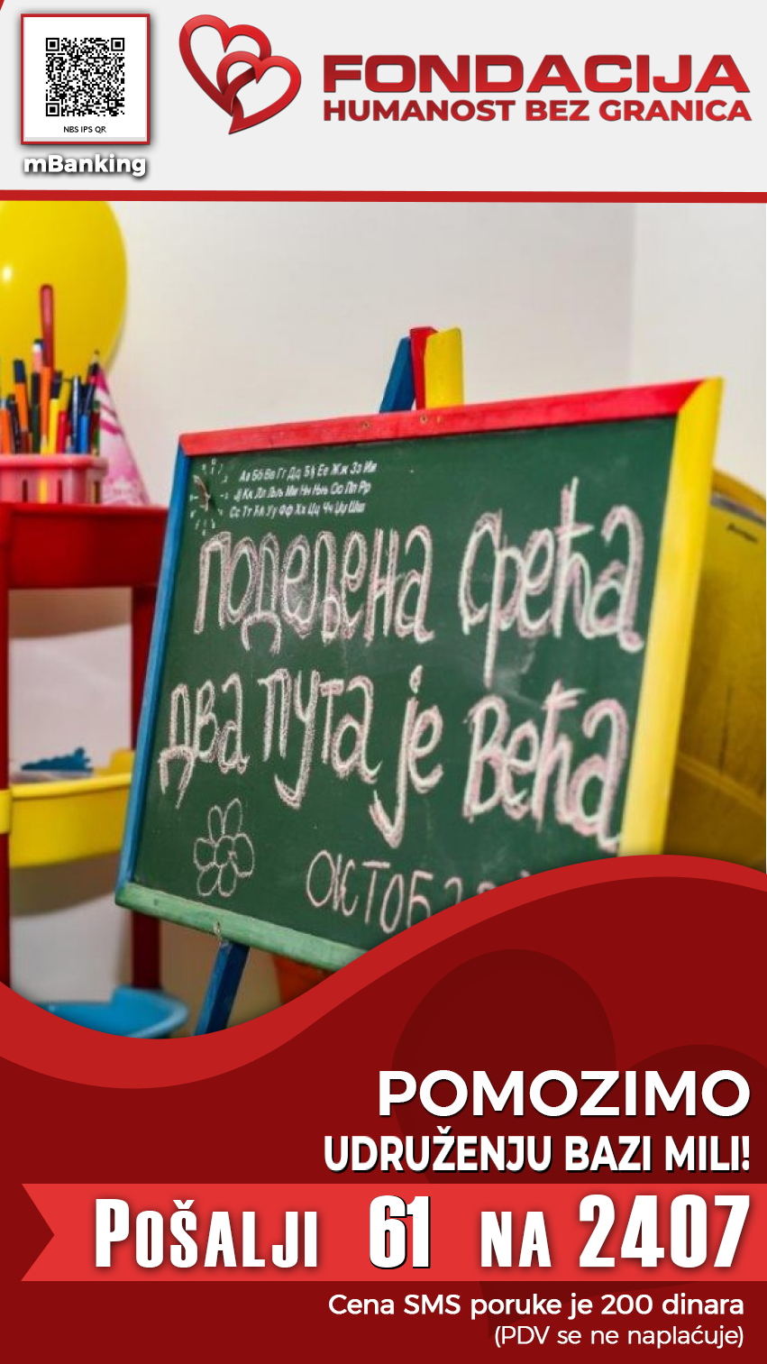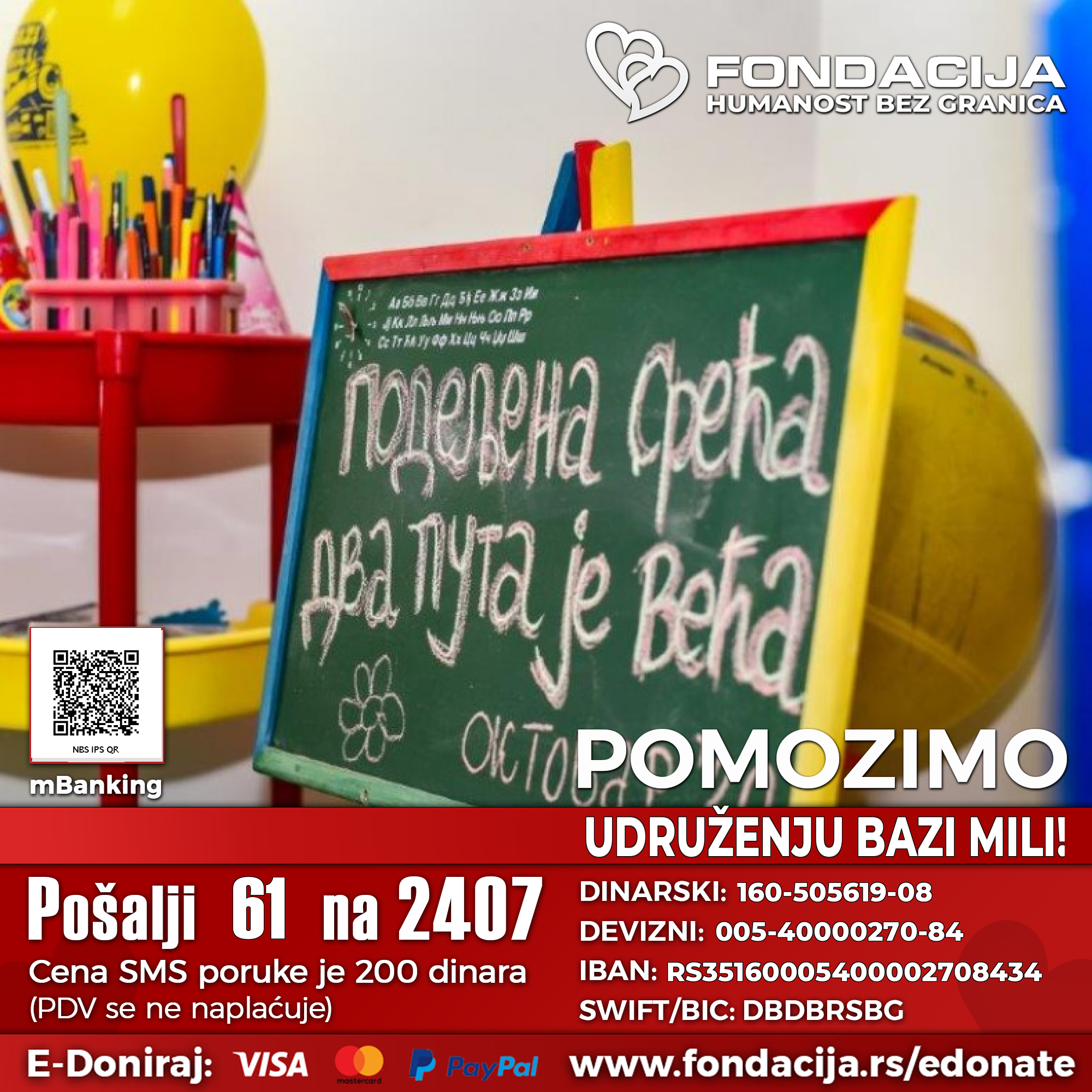 Udruženju za pomoć osobama sa autizmom BaziMili možete pomoći slanjem SMS sa brojem 61 na 2407, kao i uplatama na dinarski i devizni račun i putem e-doniraj, internet plaćanjem platnim karticima iz celog sveta, kao i preko PayPal-a
