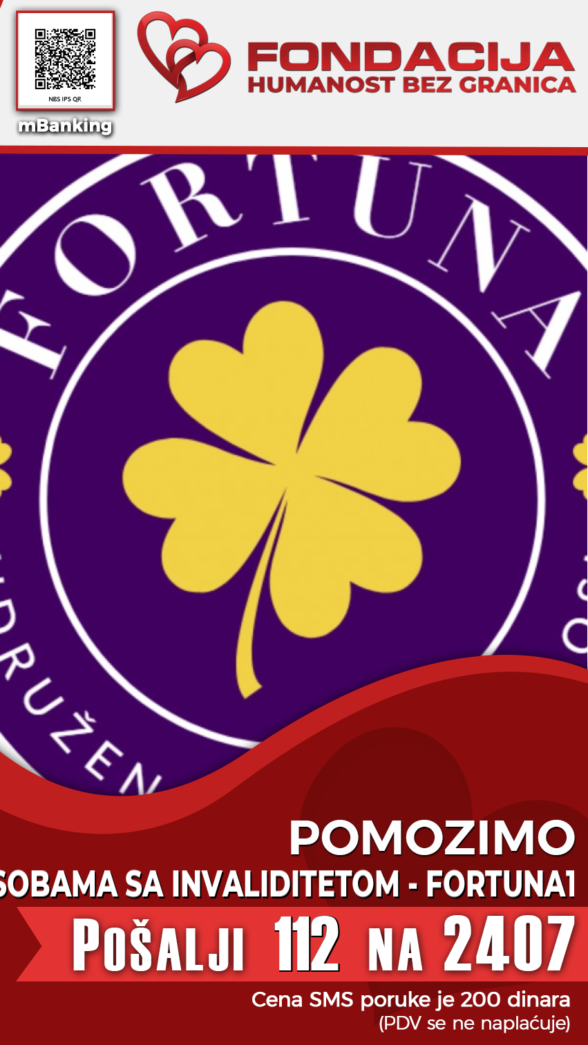 Ovim putem pozivamo sve ljude dobre volje da pomognu Udruženju Fortuna, tako što će poslati SMS sa brojem 112 na 2407. Uplate za pomoć mogu se izvršiti i na dinarski i devizni račun korisnika i putem E-doniraj internet plaćanjem platnim karticama iz celog sveta, kao i preko PayPal-a