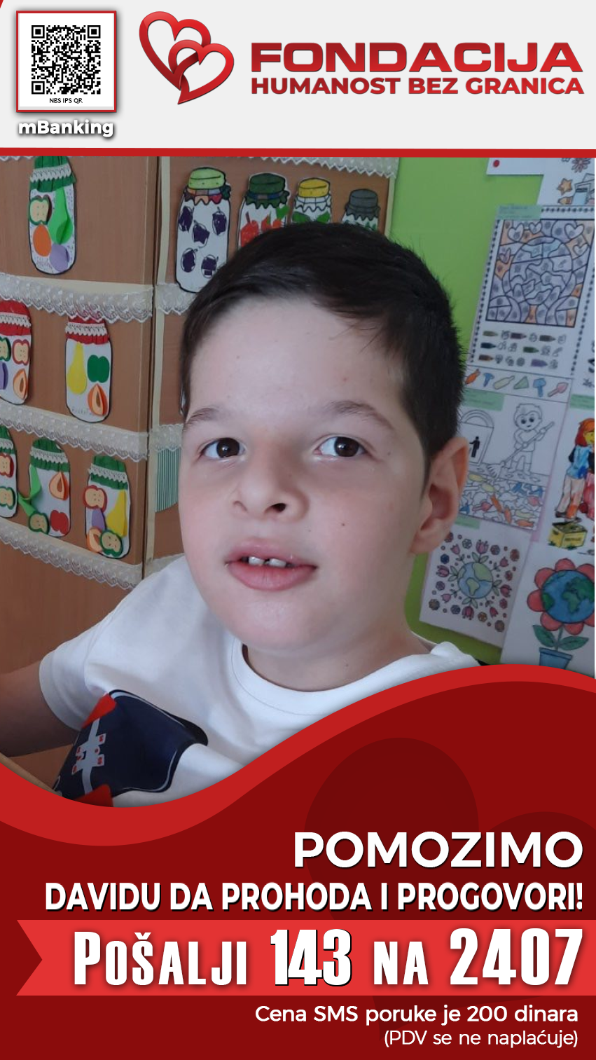 David (2011.) iz sela Crkvenac, opština Svilajnac, je mio i nežan dečak koji uprkos brojnim zdravstvenim problemima zrači toplinom i željom za kontaktom. Ima više dijagnoza: disharmonični razvoj, zaostatak u razvoju, simetrične paralize udova, akutno zapaljenje ždrela, skoliozu (bočno iskrivljenje kičme), a sumnja se i na epileptične napade ili problem sa nervnim sistemom.