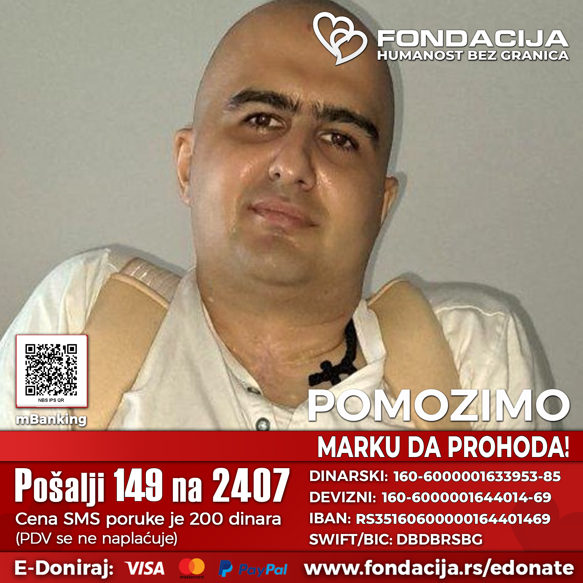 Ovim putem pozivamo sve ljude dobre volje da pomognu da Marko prohoda, tako što će poslati SMS sa brojem 149 na 2407. Uplate za pomoć u lečenju mogu se izvršiti i na dinarski i devizni račun korisnika i putem E-doniraj internet plaćanjem platnim karticama iz celog sveta, kao i preko PayPal-a