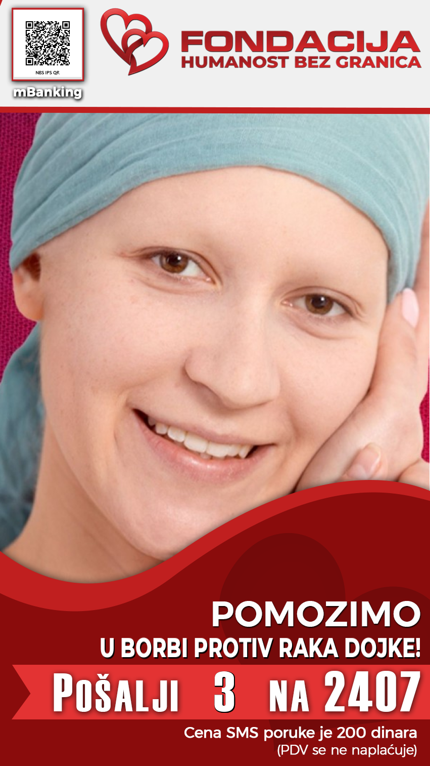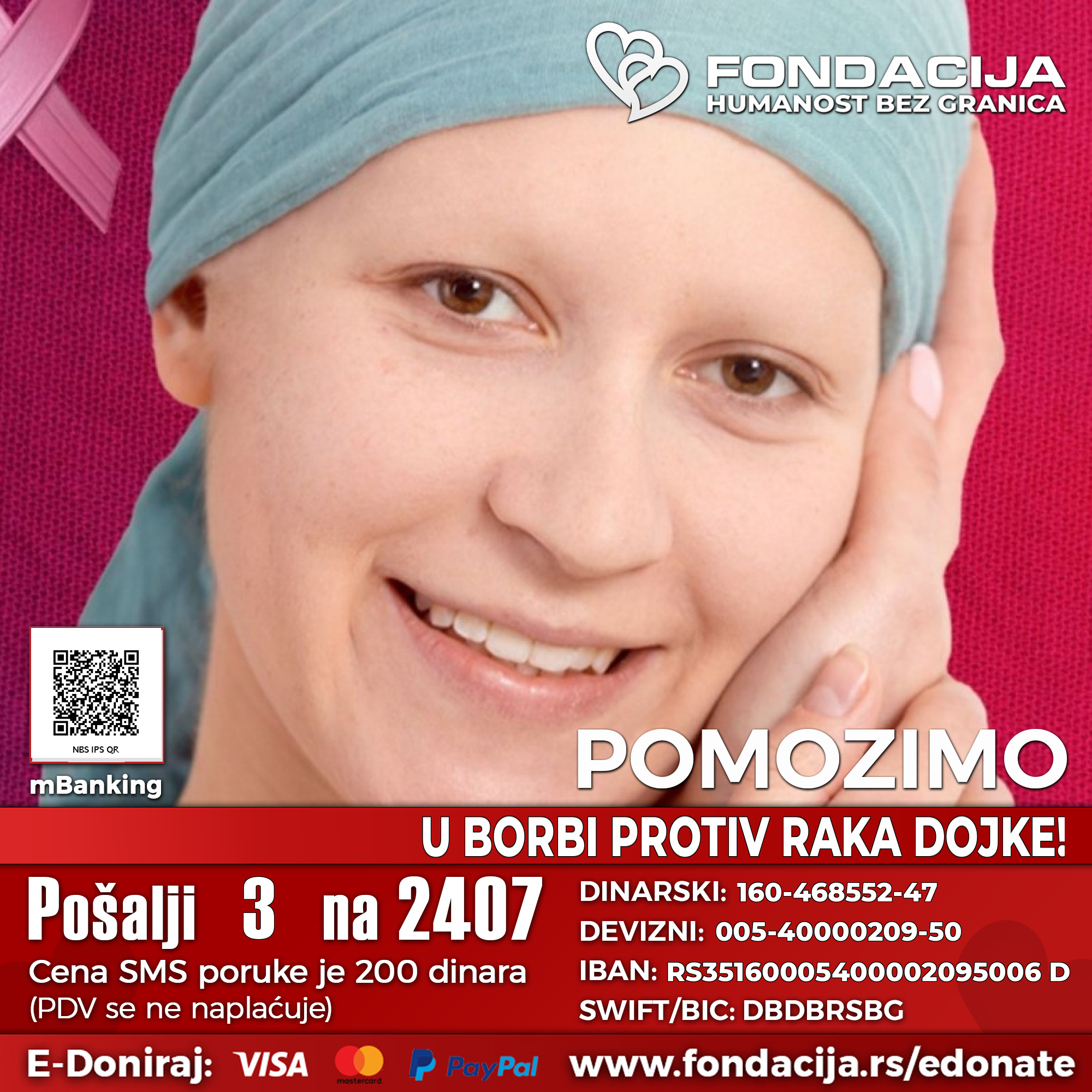 FONDACIJA - humanost bez granica, kao jedan od svojih prioriteta označila je pomoć u borbi protiv raka dojke. Upisivanjem broja 3 i slanjem SMS poruke na 2407, pomažete da se sakupi novac neophodan za prevenciju i lečenje raka dojke.