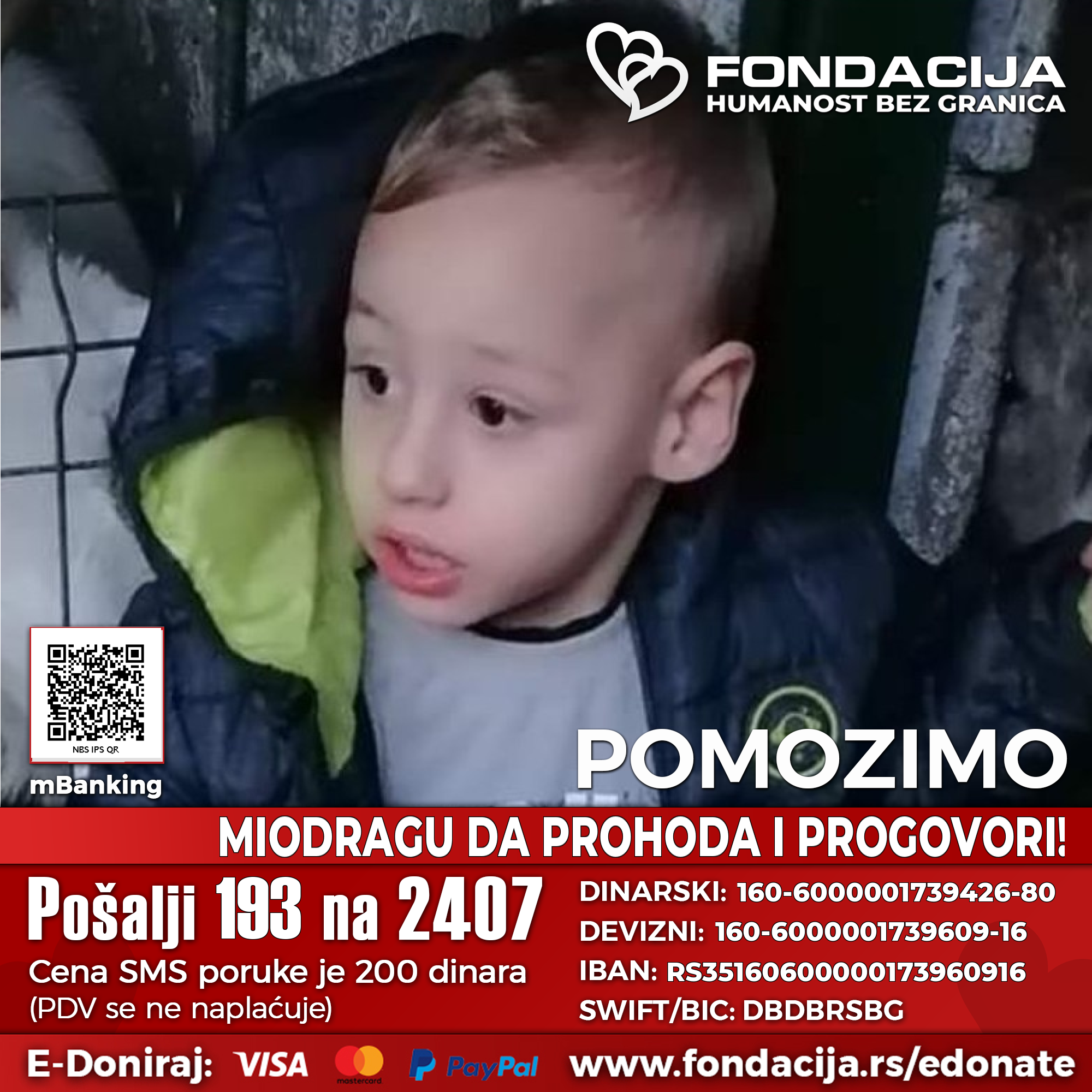 Ovim putem molimo sve ljude dobre volje da pomognu Miodragu za prvi korak i prvu reč, tako što će poslati SMS sa brojem 193 na 2407. Uplate za pomoć u lečenju mogu da se izvrše i na dinarski i devizni račun korisnika i putem E-doniraj internet plaćanjem platnim karticama iz celog sveta, kao i preko platforme PayPal.
