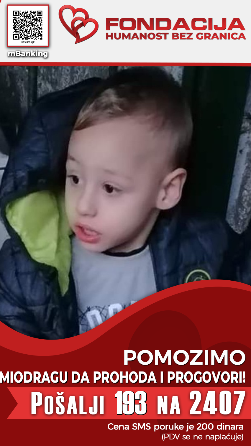 Miodrag (2017.) je prvorođeno dete iz blizanačke trudnoće. Nakon rođenja imao je nekoliko napada konvulzija, koje su mu oštetile levu stranu mozga. Miodrag ima teži oblik autizma. Dete je sa višestrukim smetnjama u razvoju. Ne hoda, ne priča i ne jede samostalno. Miodrag je dobar dečak, ljubav iskazuje zagrljajem i poljubcima. Miodraga odgaja samohrana majka koja se od prvog dana bori sama, ali više ne može.