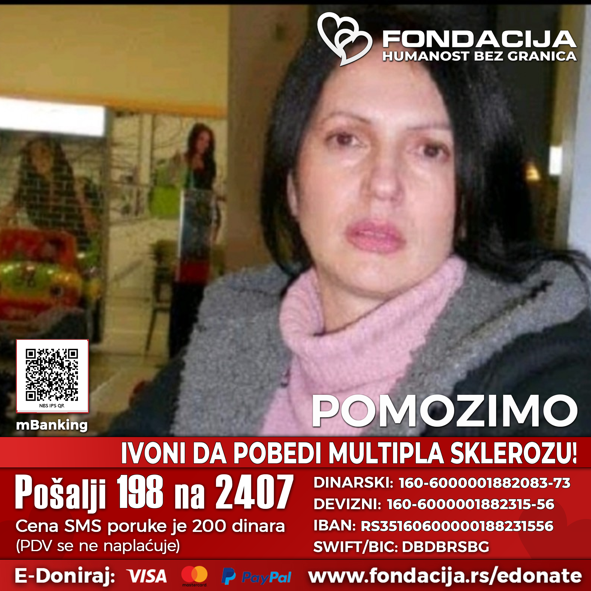 Ovim putem pozivamo sve da pomognu Ivoni da pobedi multipla sklerozu, tako što će poslati SMS sa brojem 198 na 2407. Uplate za pomoć u lečenju mogu se izvršiti i na dinarski i devizni račun korisnika i putem E-doniraj internet plaćanjem platnim karticama iz celog sveta, kao i preko platforme PayPal.