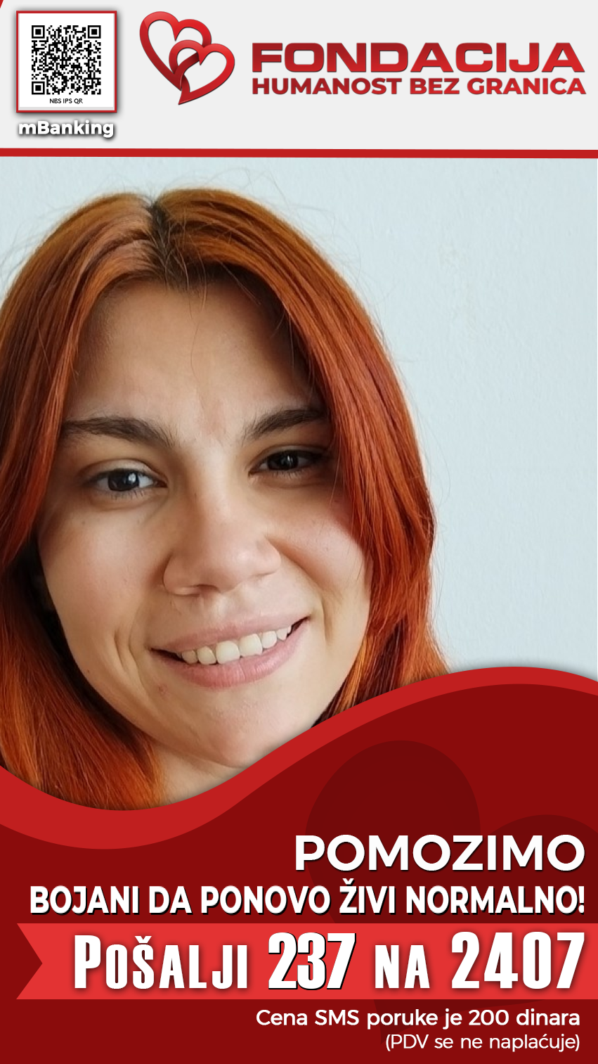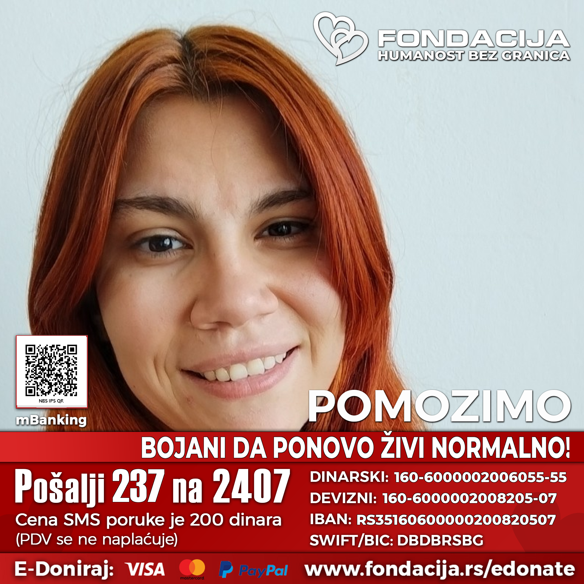 Ovim putem molimo sve ljude dobre volje da pomognu Bojani da ponovo normalno živi, tako što će poslati SMS sa brojem 237 na 2407. Uplate za pomoć u lečenju mogu da se izvrše i na dinarski i devizni račun korisnika i putem E-doniraj internet plaćanjem platnim karticama iz celog sveta, kao i preko platforme PayPal.