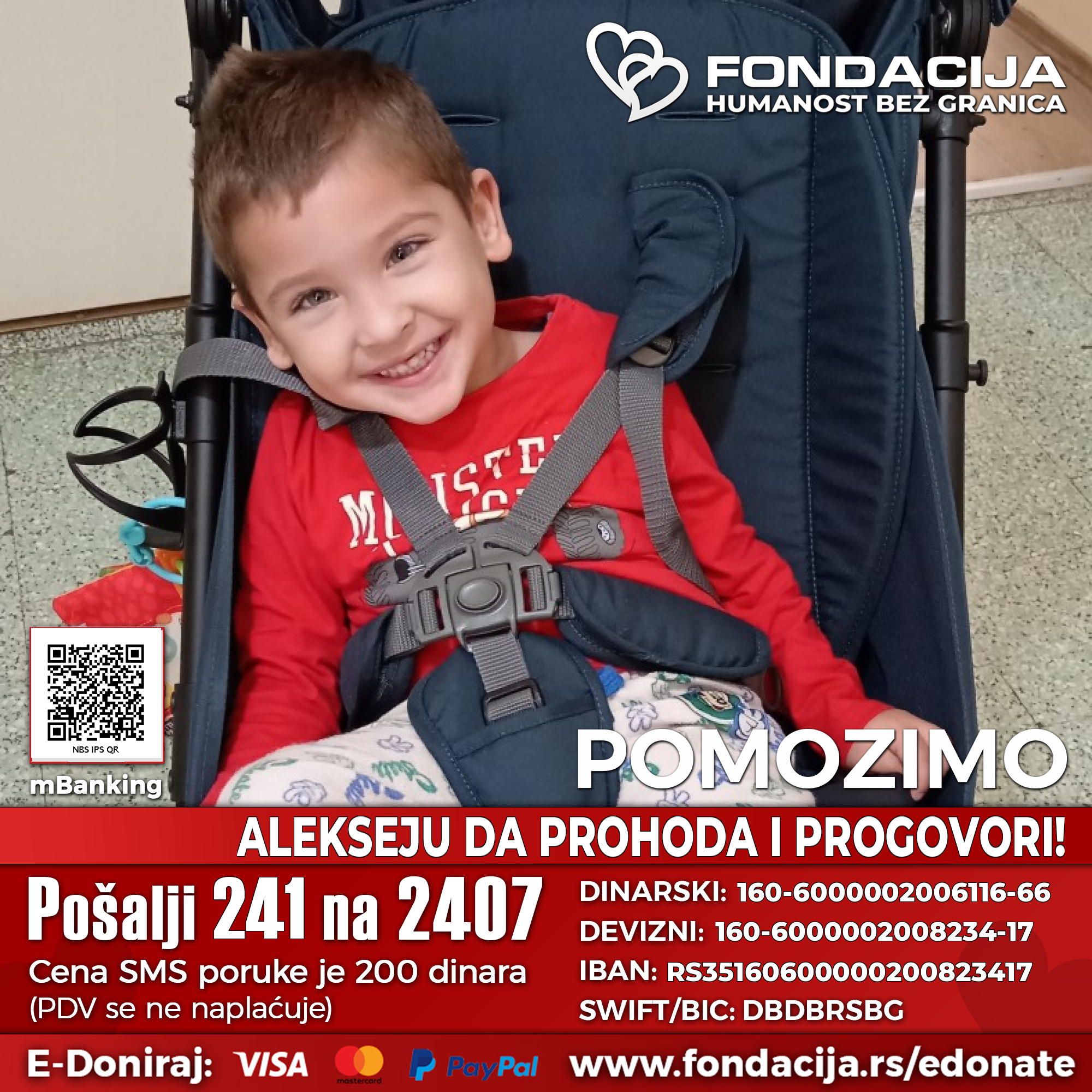 Ovim putem molimo sve ljude dobre volje da pomognu Alekseju za prvi korak i prvu reč, tako što će poslati SMS sa brojem 241 na 2407. Uplate za pomoć u lečenju mogu da se izvrše i na dinarski i devizni račun korisnika i putem E-doniraj internet plaćanjem platnim karticama iz celog sveta, kao i preko platforme PayPal.