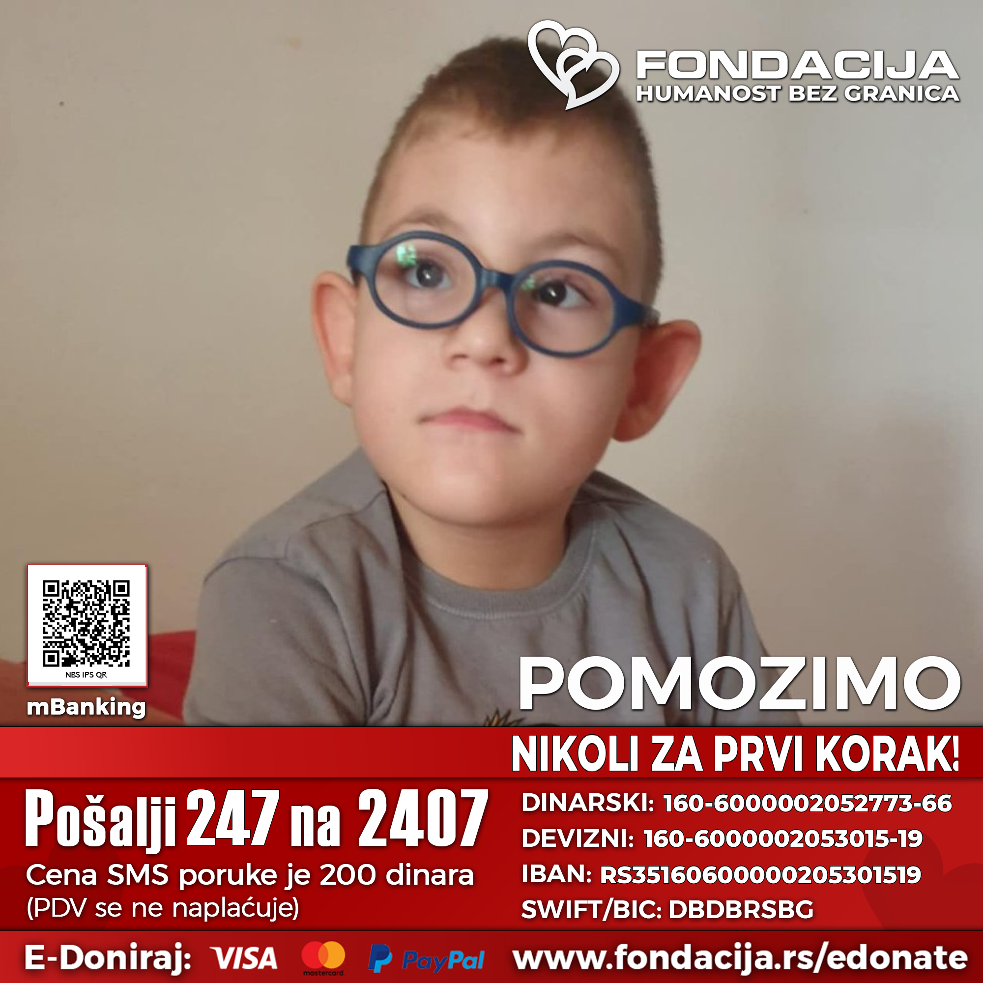 Ovim putem molimo sve ljude dobre volje da pomognu Nikoli da napravi svoj prvi korak, tako što će poslati SMS sa brojem 247 na 2407. Uplate za pomoć u lečenju mogu da se izvrše i na dinarski i devizni račun korisnika i putem E-doniraj internet plaćanjem platnim karticama iz celog sveta, kao i preko platforme PayPal.