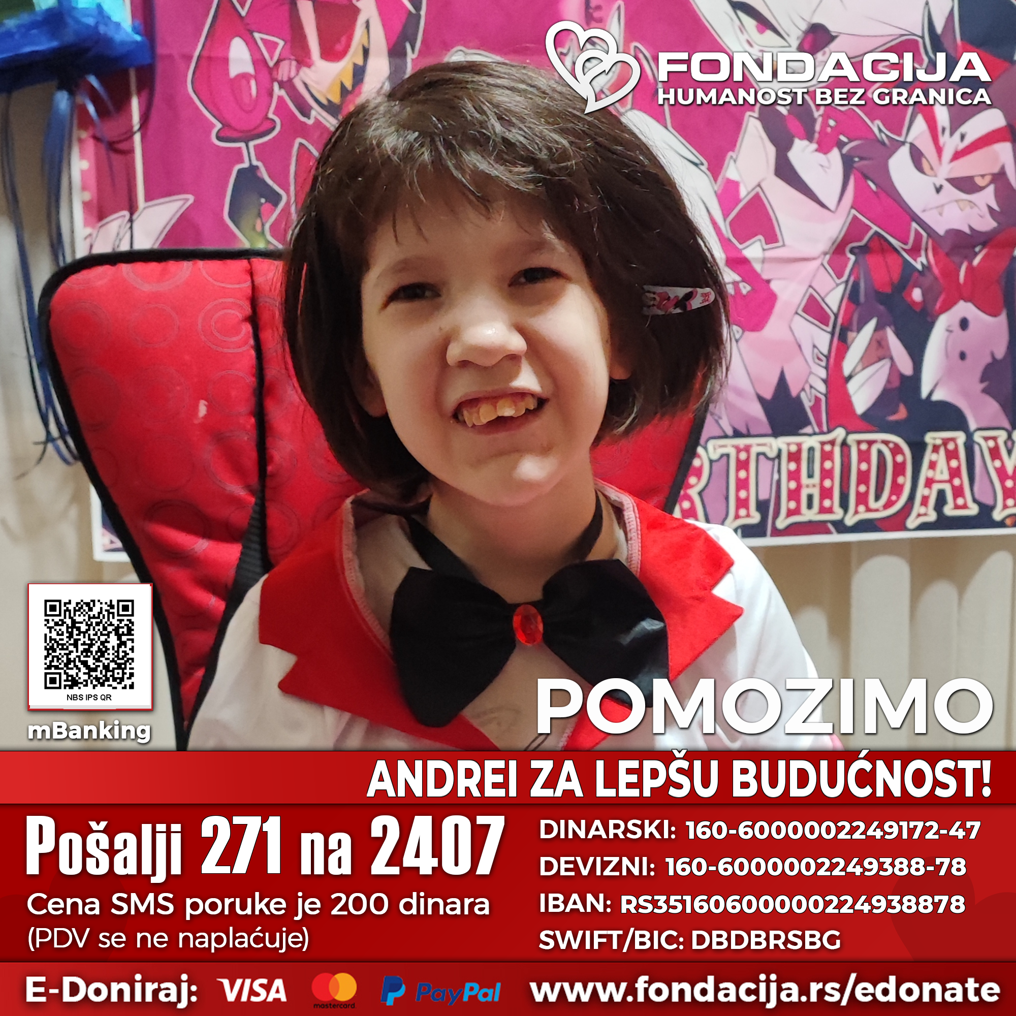 Kako bi se očuvalo postojeće stanje, sprečila dalja atrofija mišića i podstakao napredak, Andrei su neophodna sredstva za defektološke i logopedske tretmane, fizikalne terapije, suplemente, lekove, pomagala, specijalističke preglede, genetsku terapiju, kao i za troškove prevoza i smeštaja tokom lečenja.